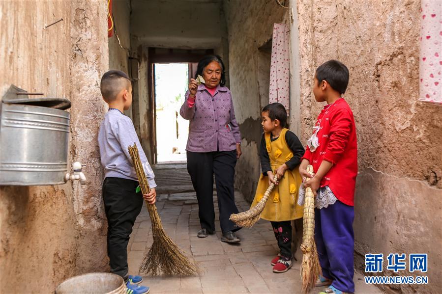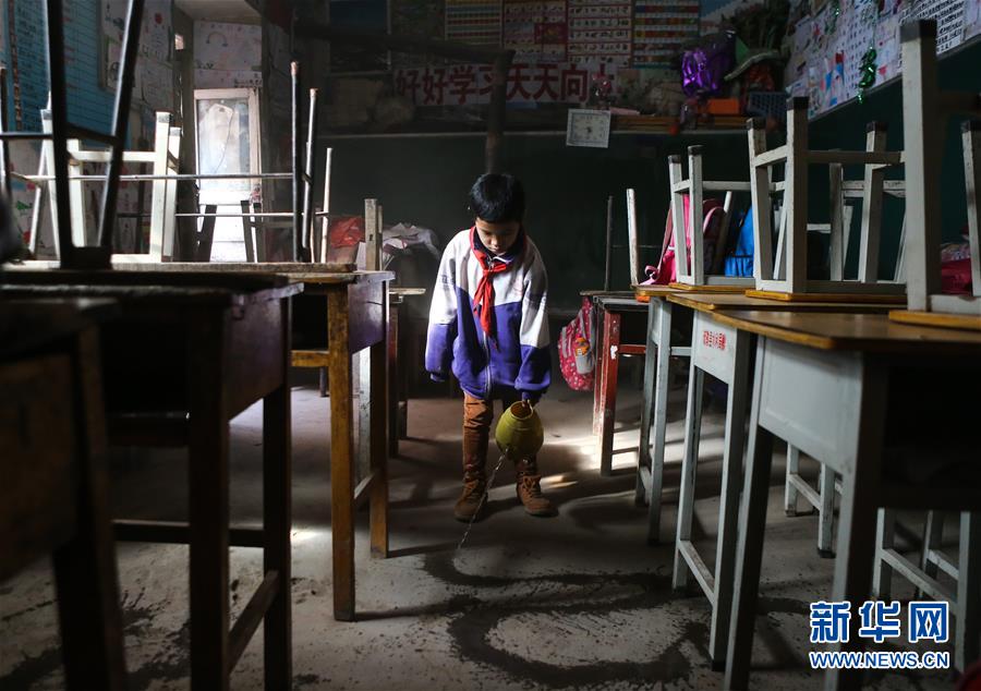 疏勒县“爱心小课堂”学生阿丽耶在教室打扫卫生。