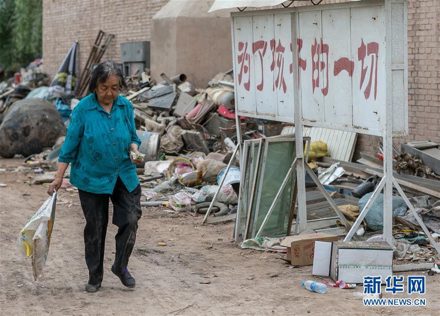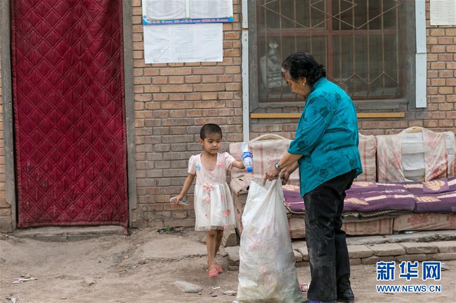 在疏勒县,小朋友把空水瓶递给拾荒的潘玉莲。
